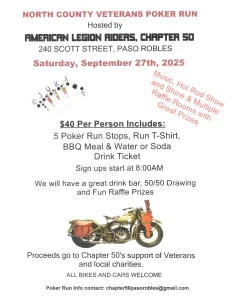 On Saturday, September 27th, 2025, the American Legion Riders, Chapter 50, are hosting the North County Veterans Poker Run at 240 Scott Street, Paso Robles.