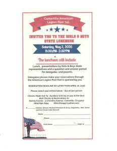 Camarillo American Legion Post 741 Invites You to the Boys and Girls State Luncheon Saturday, May 2, 202611:30 AM- 2:30 PM The luncheon will include Lunch, presentations by Girls & Boys State representatives and a question and answer periodfor delegates and parents, Delegates please make your reservations through the American Legion Post that