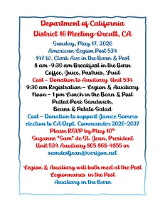See You on Sunday, May 17, in Orcutt! We’re meeting at the American Legion Post 534 located at 147 W. Clark Ave in the Barn (& Post). 8am – 9:30am Breakfast in the Barn Coffee, Juice, Pastries, Fruit Cost – Donation to Auxiliary Unit 534 9:30am Registration—Legion & Auxiliary 8am –