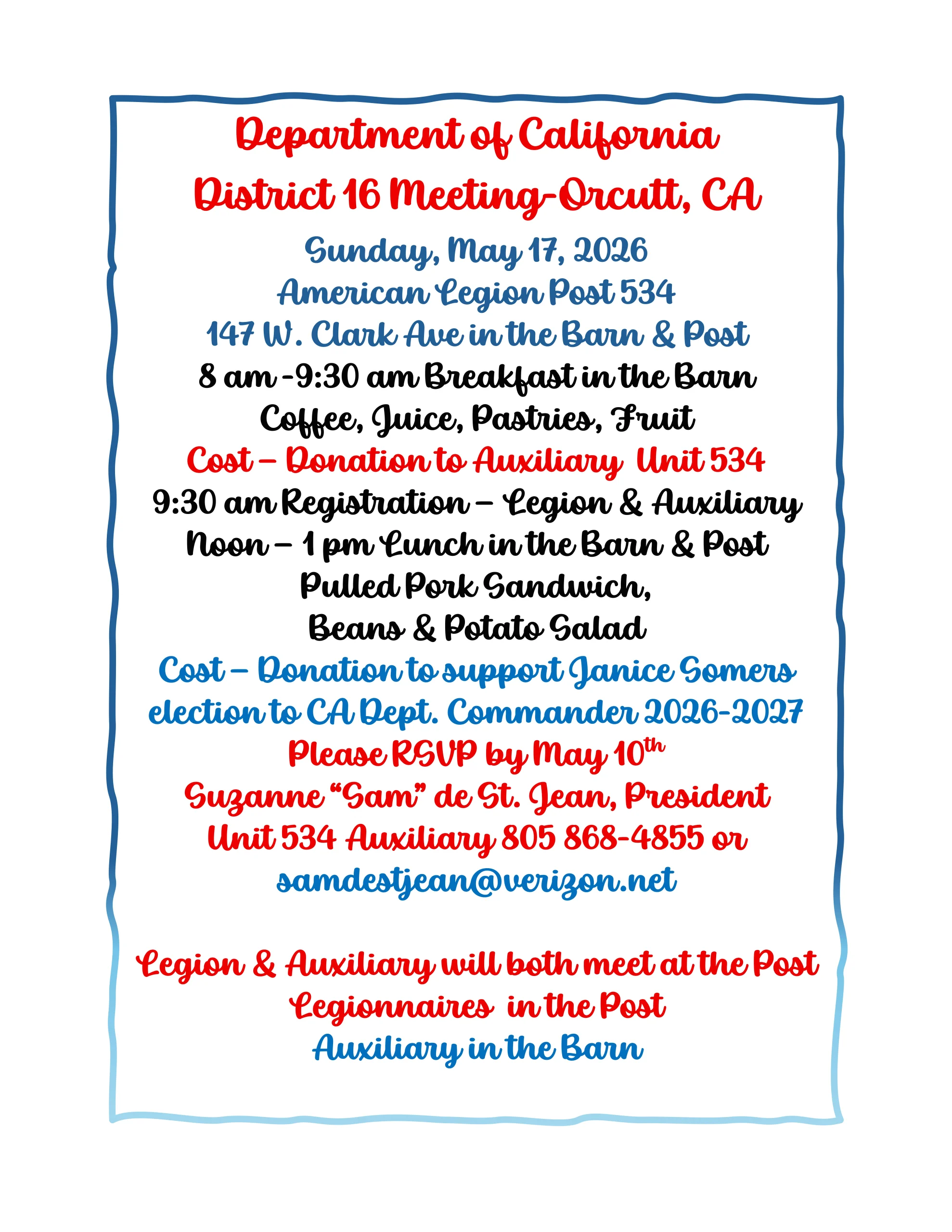 Lunch in the Barn & Post Pulled Pork Sandwich, Beans & Potato SaladCost – Donation to support Janice Somers election to CA Dept. Commander 2026-2027
